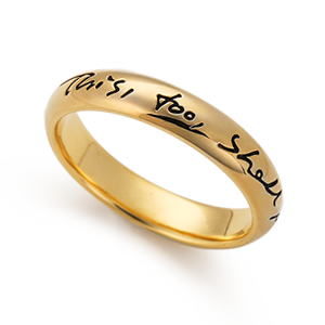 The handwritten letters of "This Too Shall Pass Away" are engraved on the ring. It's a ring that expresses a desire for courage and wisdom that is not proud when you're happy and not frustrated when you're sad. |